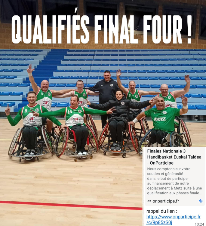 Suite à sa dernière victoire, c’est maintenant officiel, l’équipe basque de Basket Fauteuil disputera les phases finales du Championnat de France les 30 et 31 mai prochain à Metz.